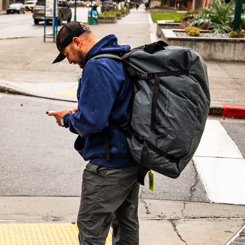 The water-resistant STOL series of duffel bags are designed for the rigorous travel experienced when hopping planes, trains, and automobiles (and of course bush planes) when headed to the mountains. Constructed of a highly durable and waterproof textile that is primarily used in sails for high-end sail boats. The STOLs provide useful functionality in a lightweight and compact package. Unlike many popular designs today, we specifically designed the STOLs without a rigid structure so when not in use they can be easily rolled up and tucked away. A large Aquaguard YKK zipper is easy to use, and an internal storage pocket and compression straps make packing a breeze. The STOL 7000 is strategically sized to the maximum checked baggage limit, and the STOL 4000 is ideal for carry-on use. Each incorporates Frost-vale’s shoulder straps for convenient carry through the airport.