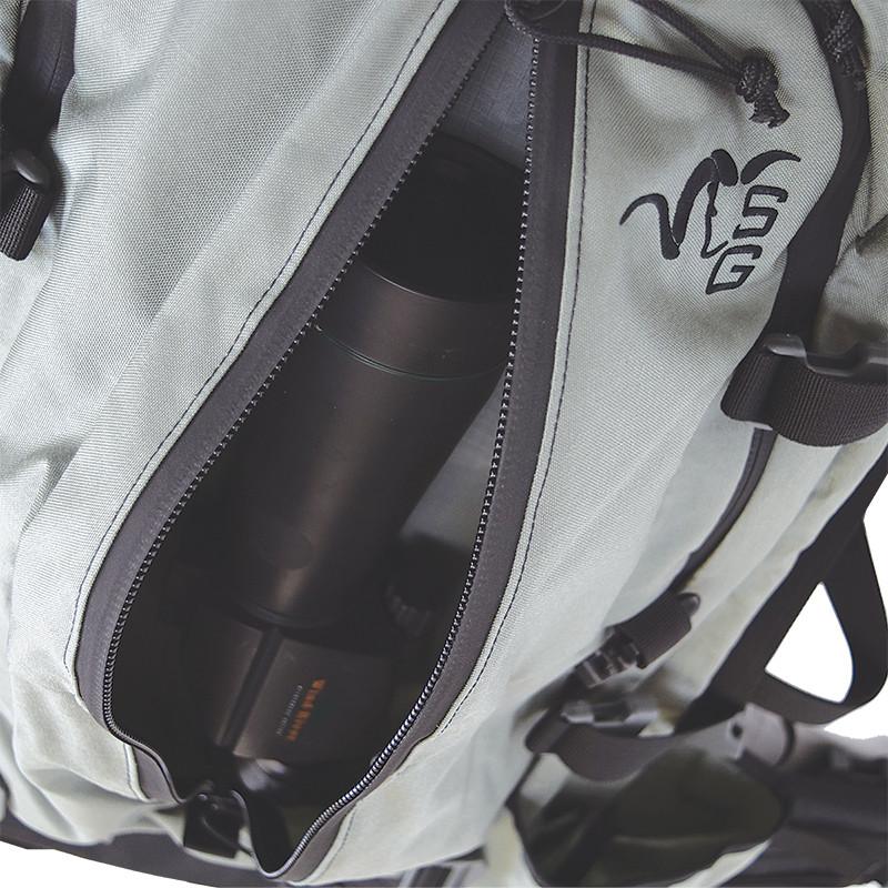 A 22" front vertical pocket is incorporated for quick access to a spotting scope, sized to fit the largest of glass. Attachment points for Swing Out Pockets are located just inside the zipper for quick access to small items needed along the trail. Large external open-top pockets are located on each side of the pack for the carry of a tripod, water bottle, or the stock of a rifle.